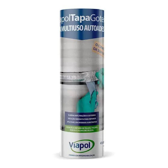 Viapol Tapa Goteira é uma fita autoadesiva fabricada a base de asfalto modificado com adição de polímeros. Possui acabamento de filme de alumínio, assegurando maior durabilidade ao produto, reflexão dos raios solares e impermeabilidade.